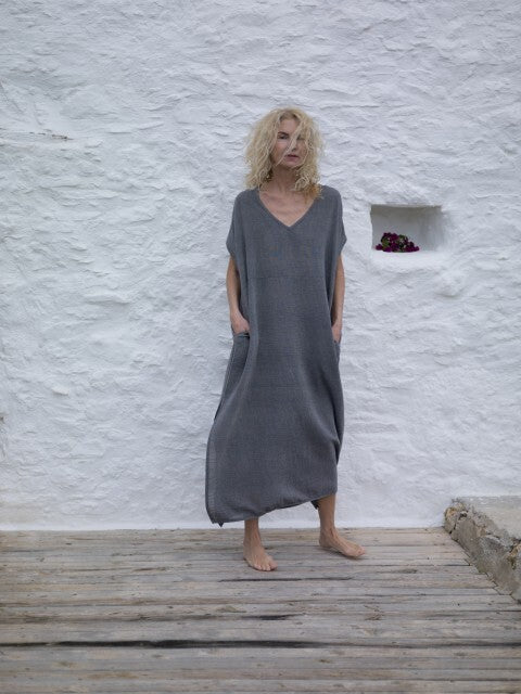The V-neck classic caftan is perfect as an easy elegant beach cover-up or as a dress for a warm day! With its relaxed form, it's flowy, organic, and simply chic. Its short sleeves complete the two slits on its skirt, creating a flattering look for all! Ethically produced, made for your comfort and style. Dress it however you see it fits you!