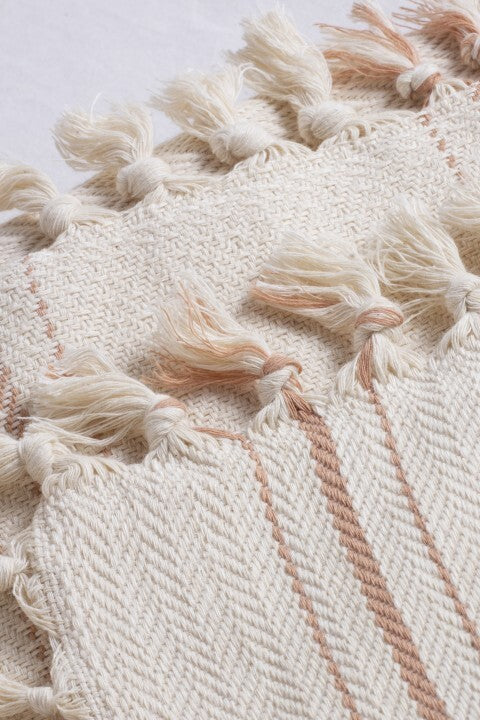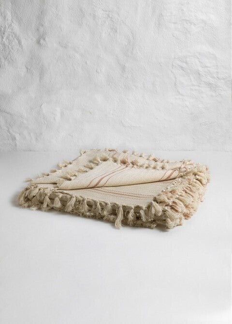 The Striped Throw/Blanket with modern stripes and tassels is hand-loomed from undyed organic Turkish cotton.