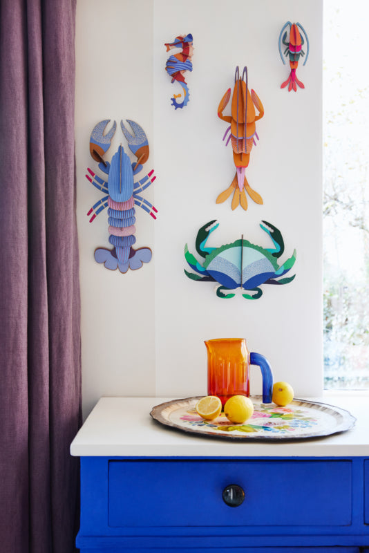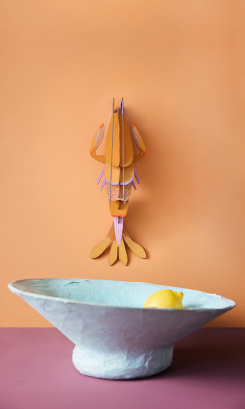 Discover a magical world of creatures beneath the quiet surface of the sea. Here, vigorous and graceful sea life meander, hover, and swim through the depths among corals, shells, and particles of sand. Bring a new level of beauty to your home with this enchanting amber langoustine..